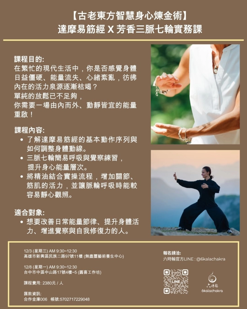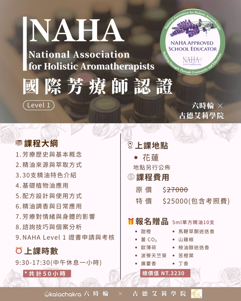 六時輪芳療將節氣經絡、八大體質與三脈七輪融合為獨特的核心療程系統,結合古老中醫智慧與現代能量療法,打造全面平衡的身心靈芳療方案。這套專業完整的療程系統能讓芳療師在服務客戶時更具信心與效能。