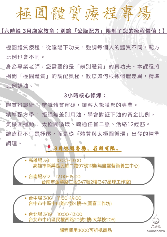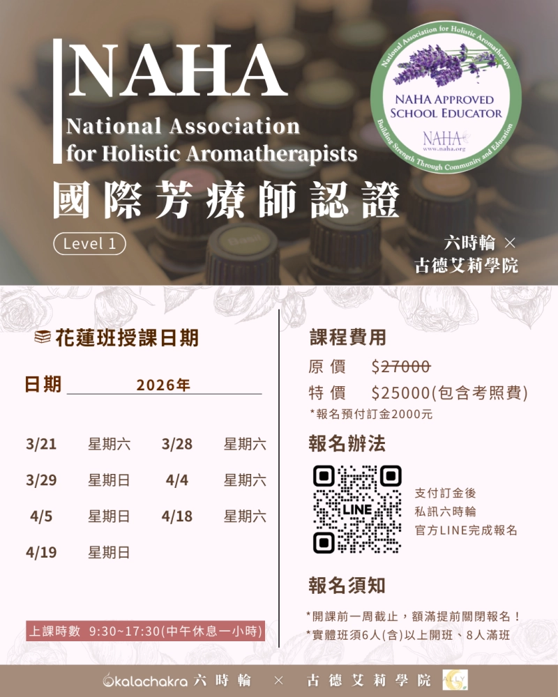 六時輪芳療將節氣經絡、八大體質與三脈七輪融合為獨特的核心療程系統,結合古老中醫智慧與現代能量療法,打造全面平衡的身心靈芳療方案。這套專業完整的療程系統能讓芳療師在服務客戶時更具信心與效能。